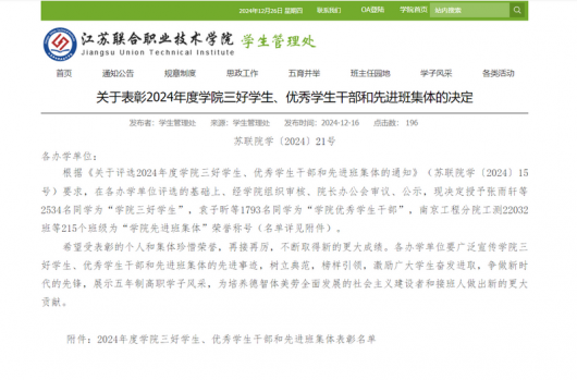 近日,江苏联合职业技术学院发布《关于表彰2024年度学院三好学生、优秀学生干部和先进班集体的决定》,我校乔满强、张淼缪、孙雨情、王硕、周建霄、张智、葛颖、张宇恒、吴尚泽...